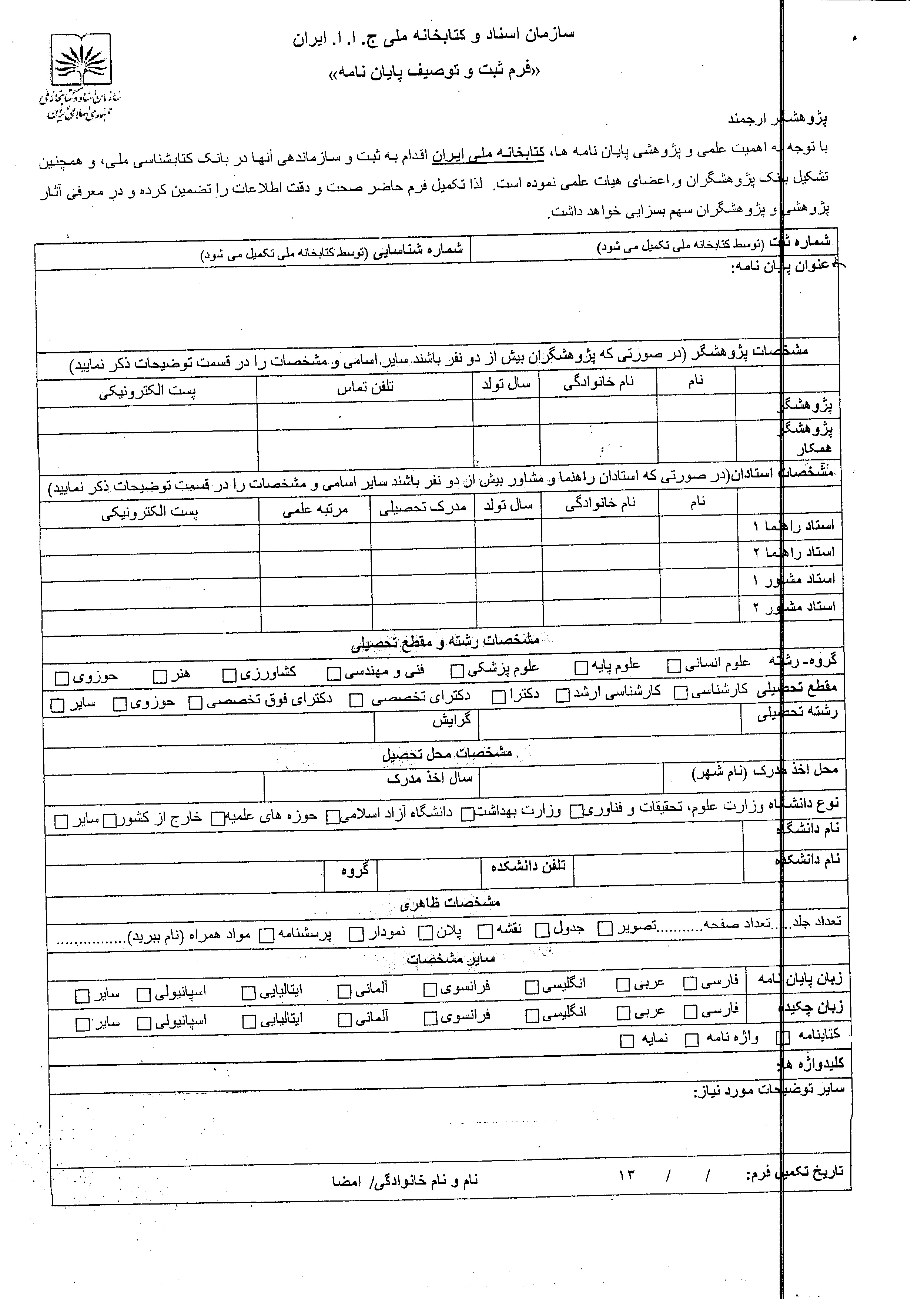 کاربرگ ثبت و توصیف پایان نامه (کتابخانه ملی)